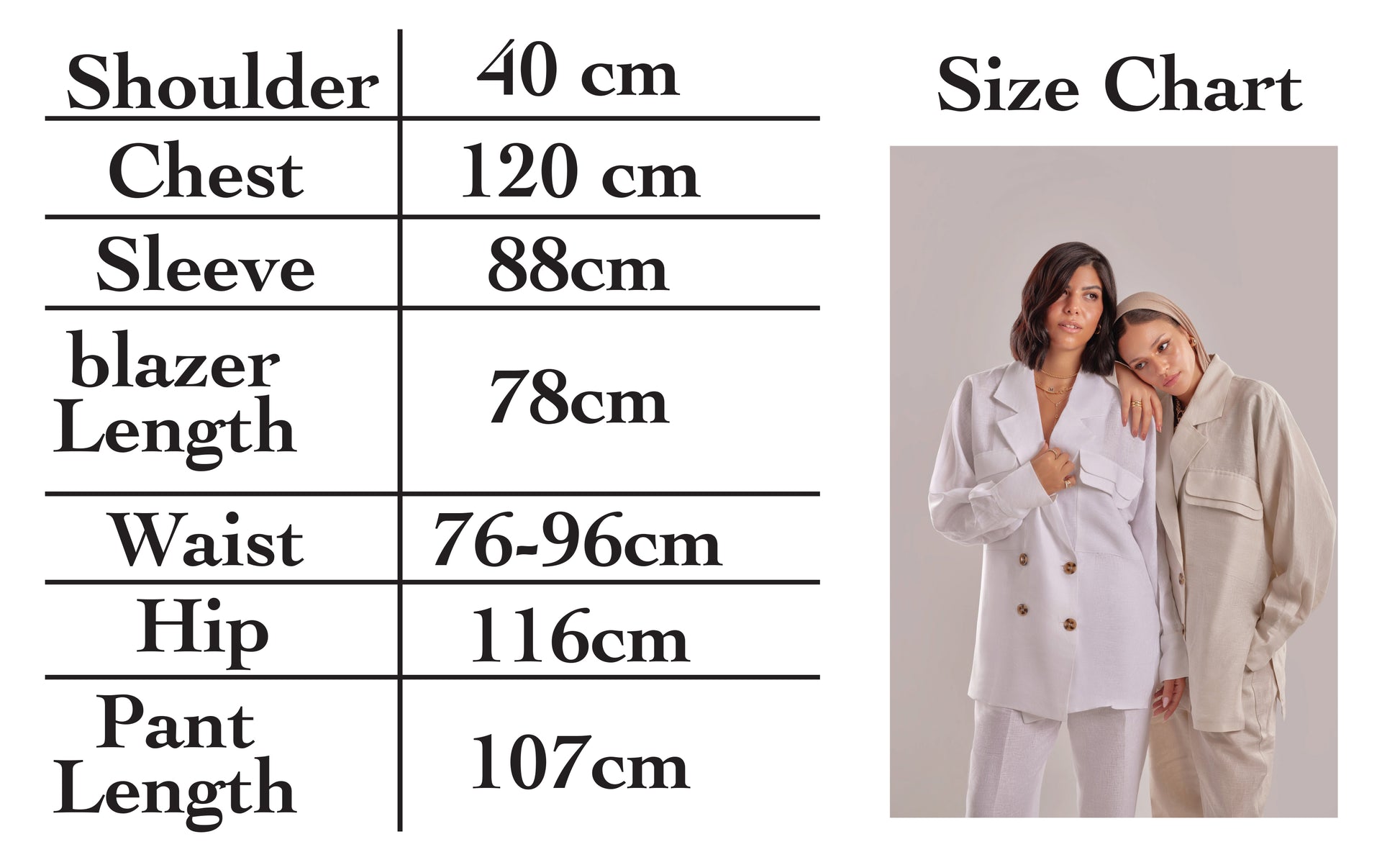 Made from 100% pure linen, it features a double-breasted oversized blazer with tortoise-shell buttons and structured flap pockets, paired with relaxed wide-leg trousers.