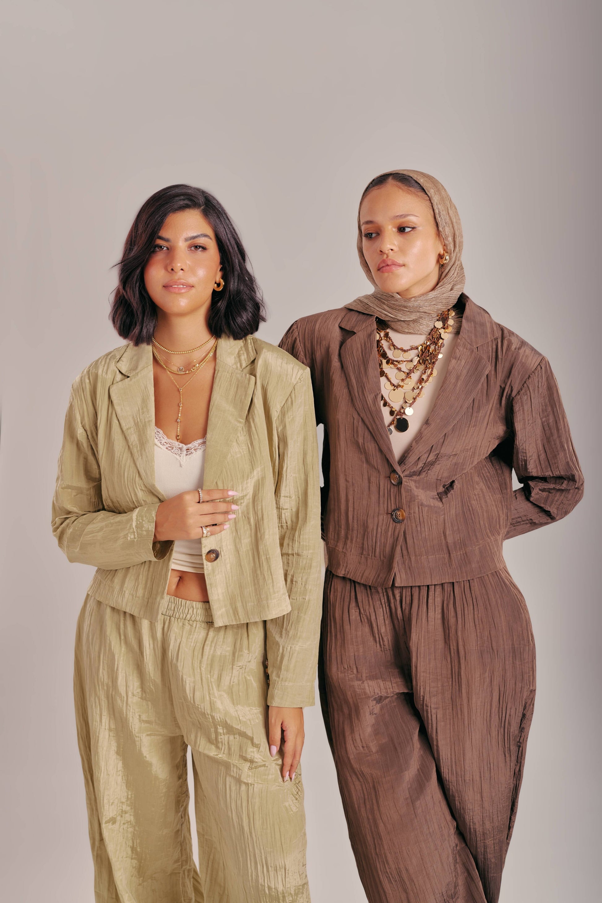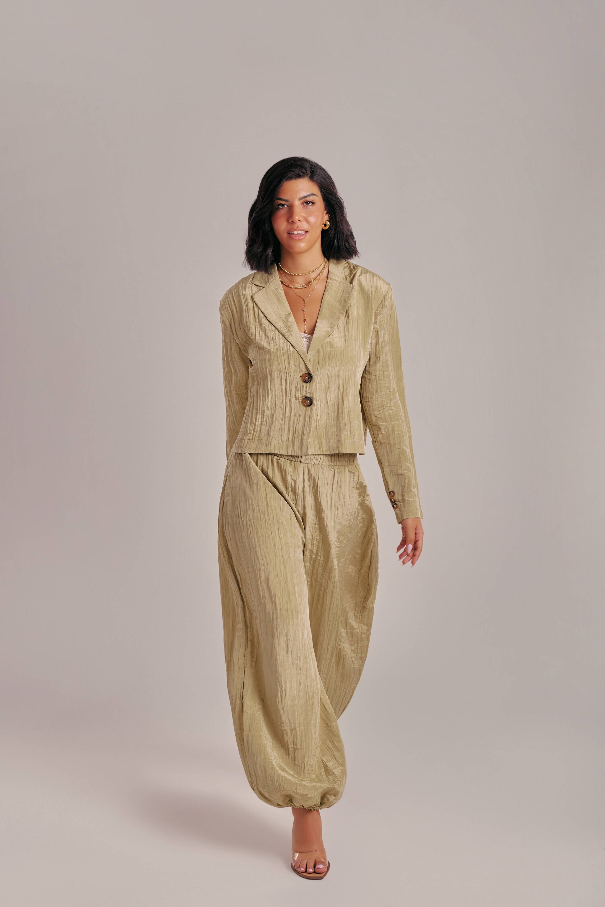 A statement two-piece crafted in lightweight crinkle fabric featuring a cropped single-breasted blazer and cuffed trousers with elastic hems. The textured fabric adds effortless chic while the tapered ankle fit makes it versatile for both elevated and casual styling. Available in Olive and Mocha& powder Pink.
