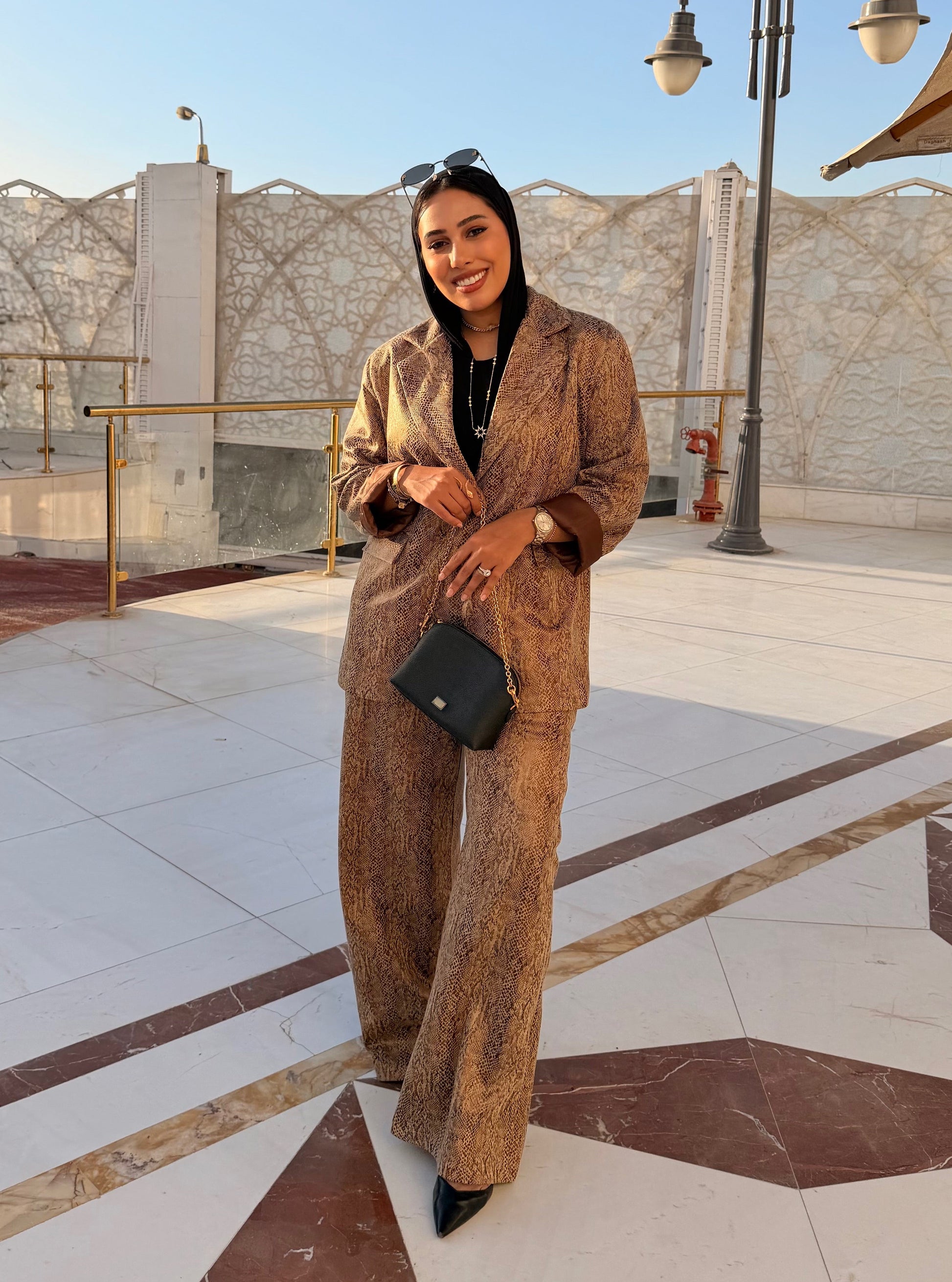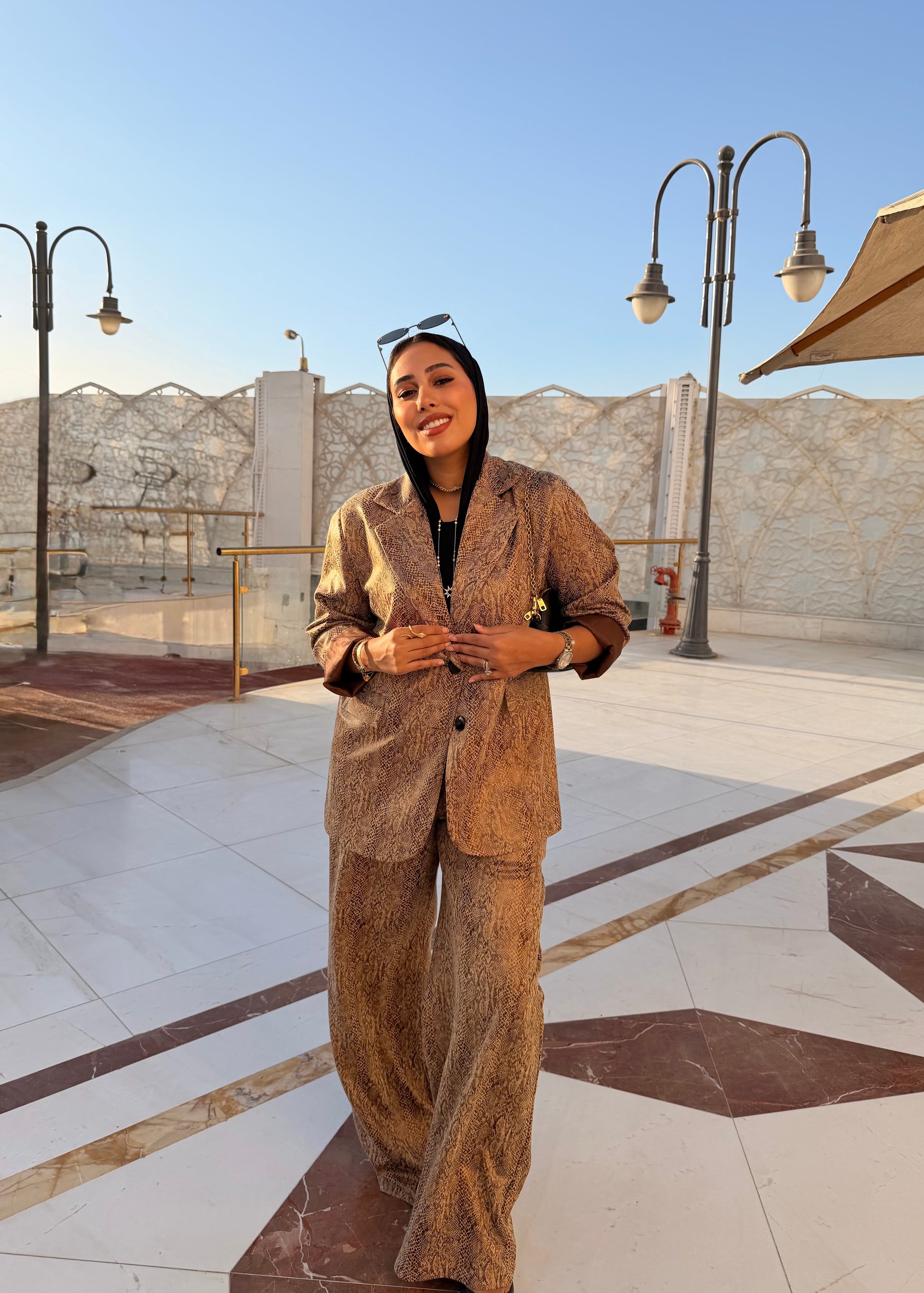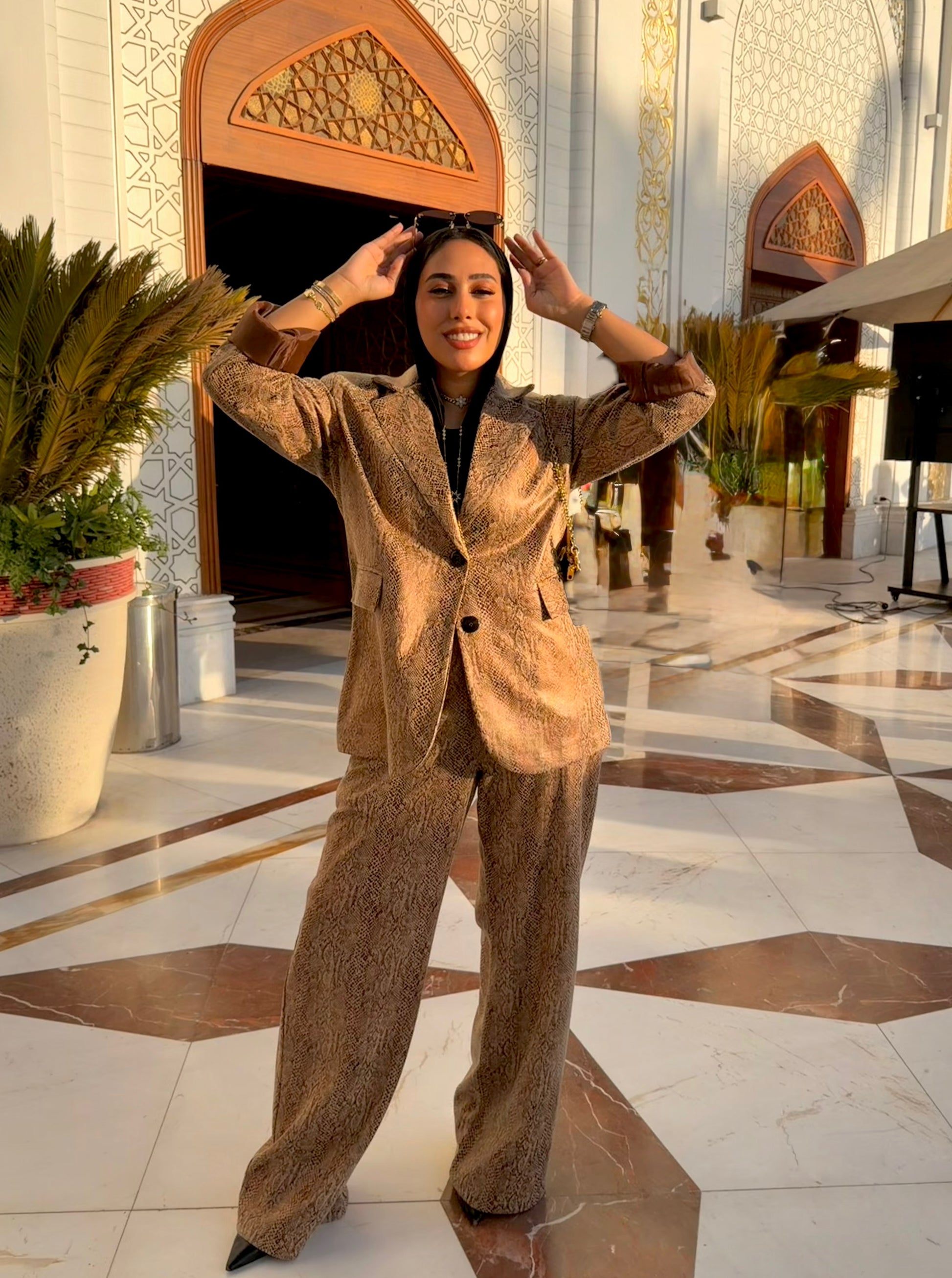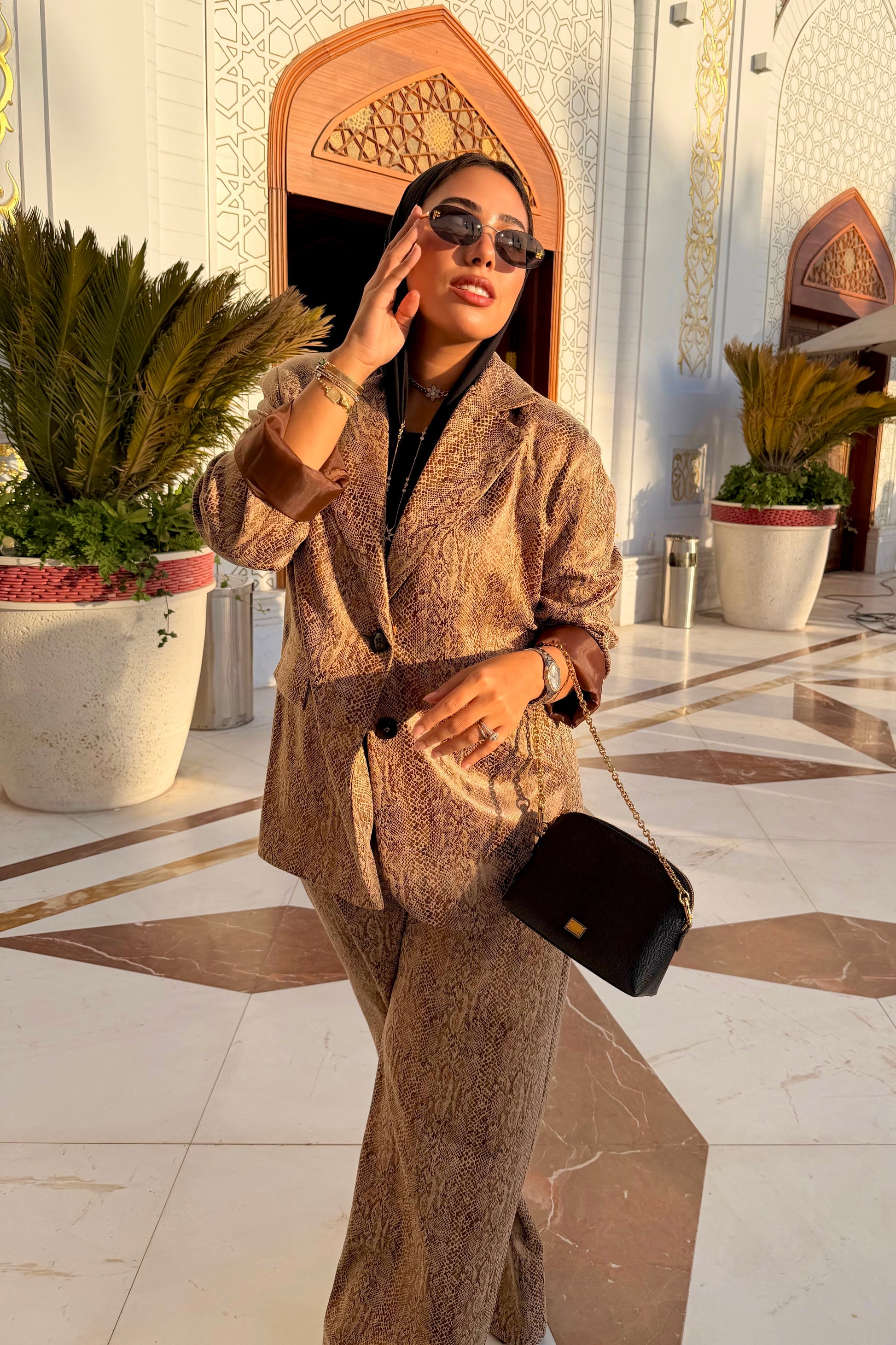 Turn heads with this bold yet elegant snake-print leather set, designed for the confident woman who owns her style. The tailored blazer features a sleek single-button closure and structured shoulders, paired with wide-leg trousers that flow effortlessly with every step. Its soft sheen and textured pattern bring a luxurious twist to the classic suit silhouette — perfect for day-to-night sophistication. Pair it with heels and statement accessories for an empowering, high-end look.